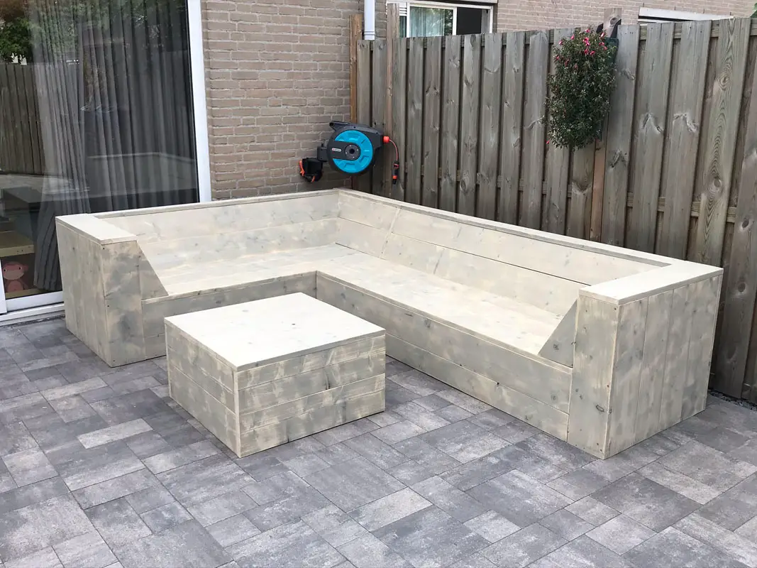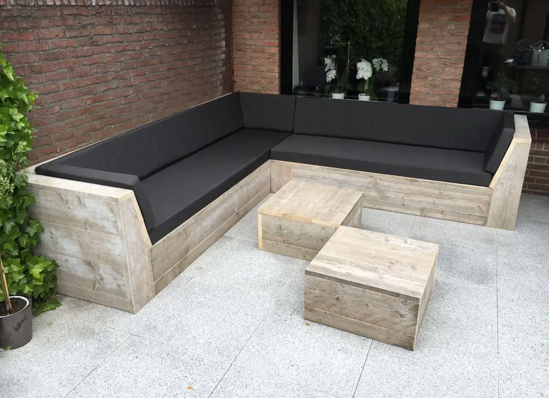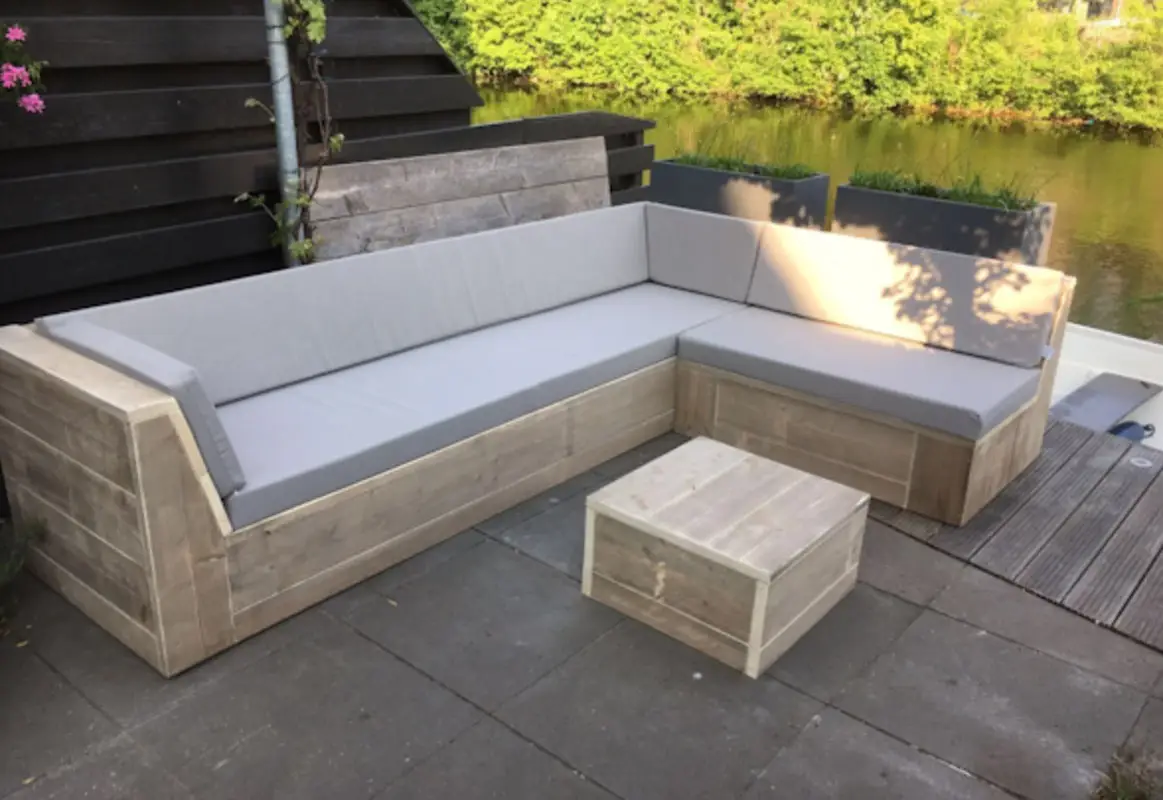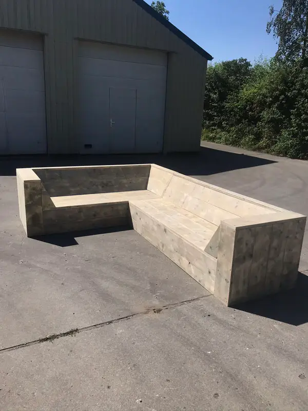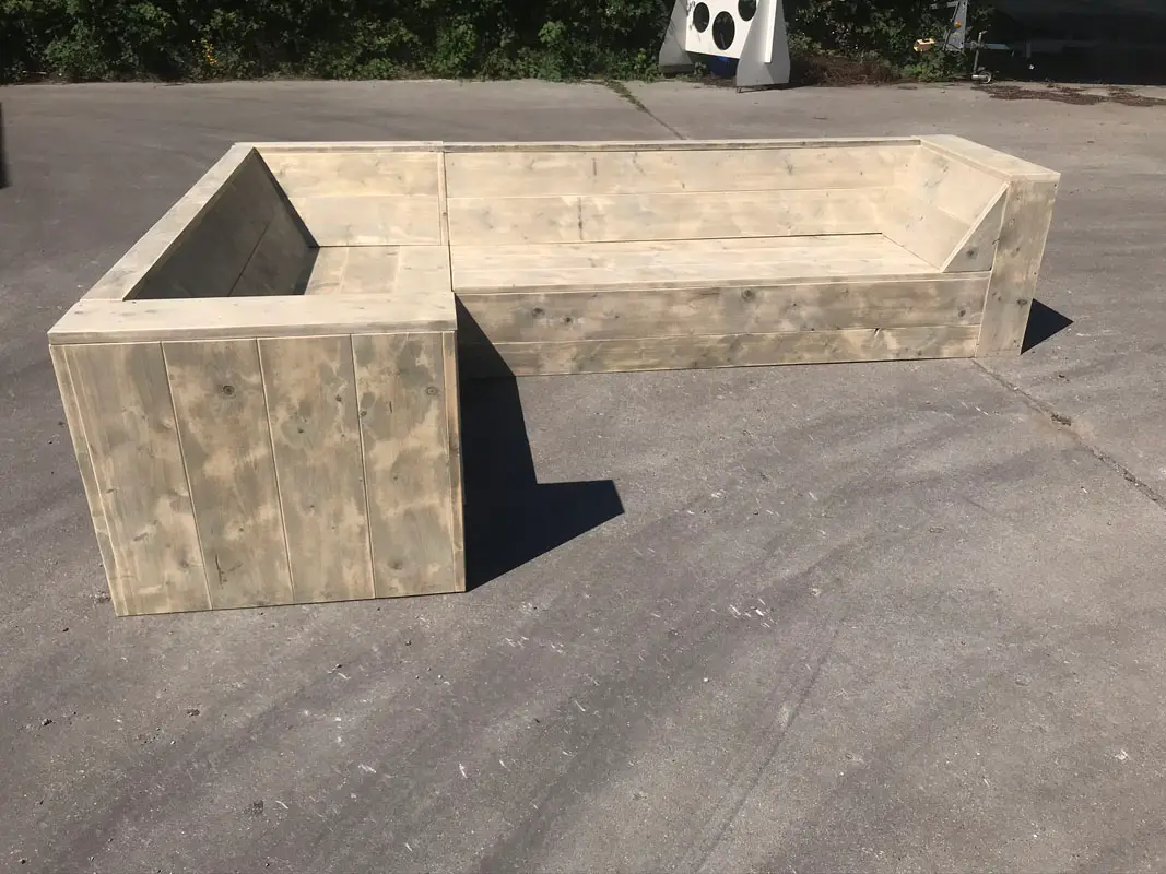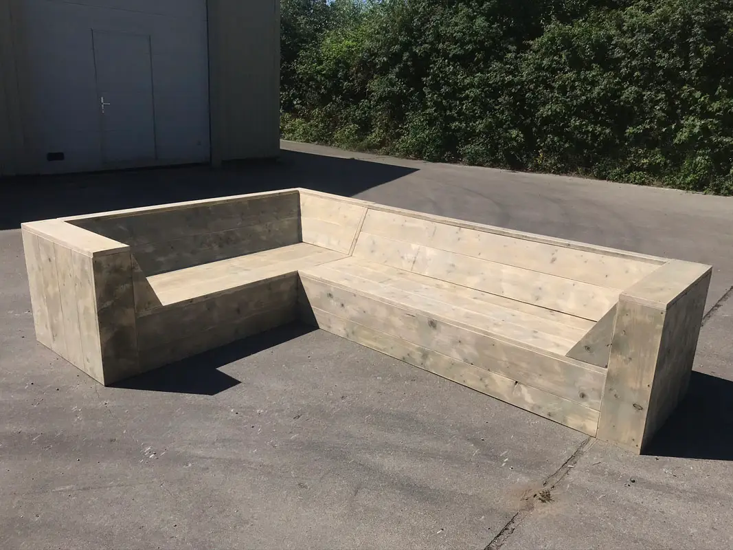 Steigerhouten hoekbank met schuine arm/ open aantal